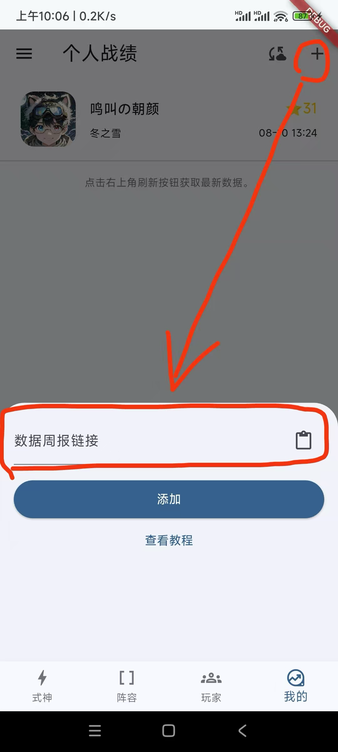 点击右上角的【+】按钮,将链接复制到【数据周报链接】中,点击添加。添加成功后,点击右上角的刷新图标即可获取最新战报。默认获取前3天的战报,在设置中可以设置获取战报数据的范围。